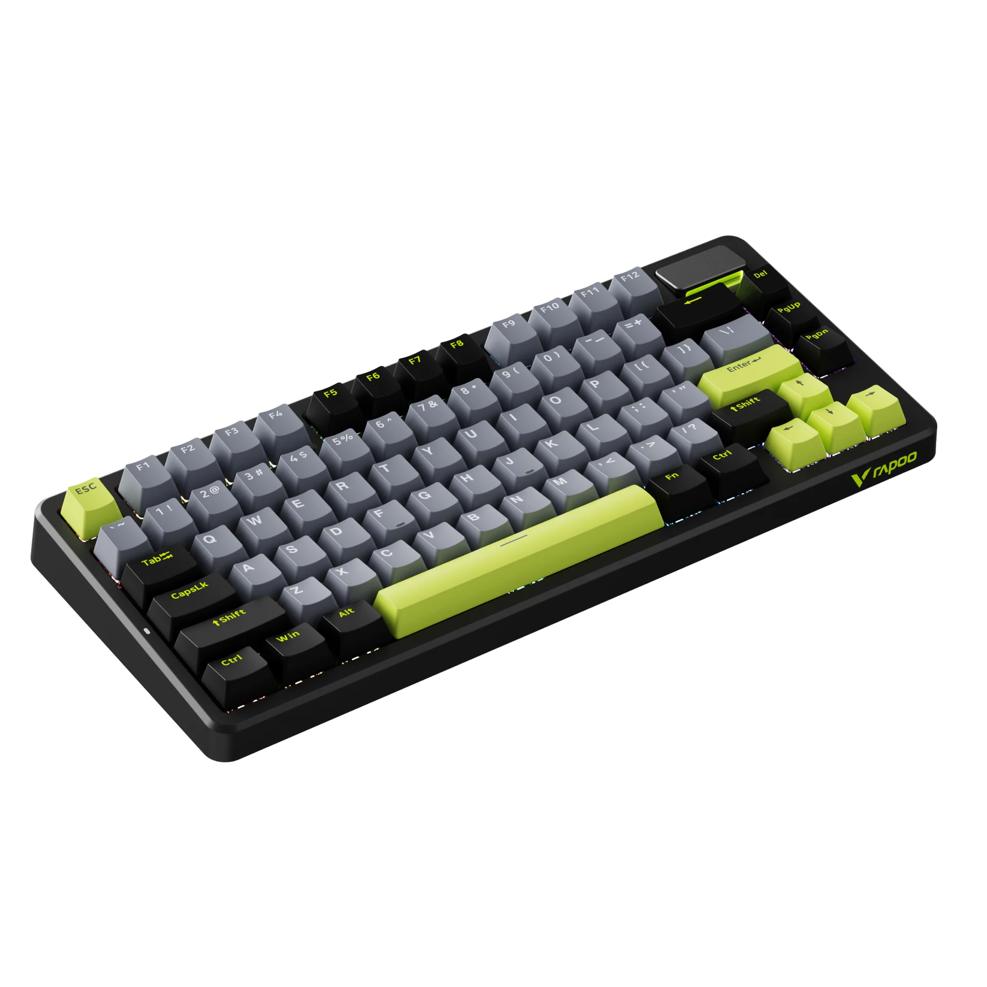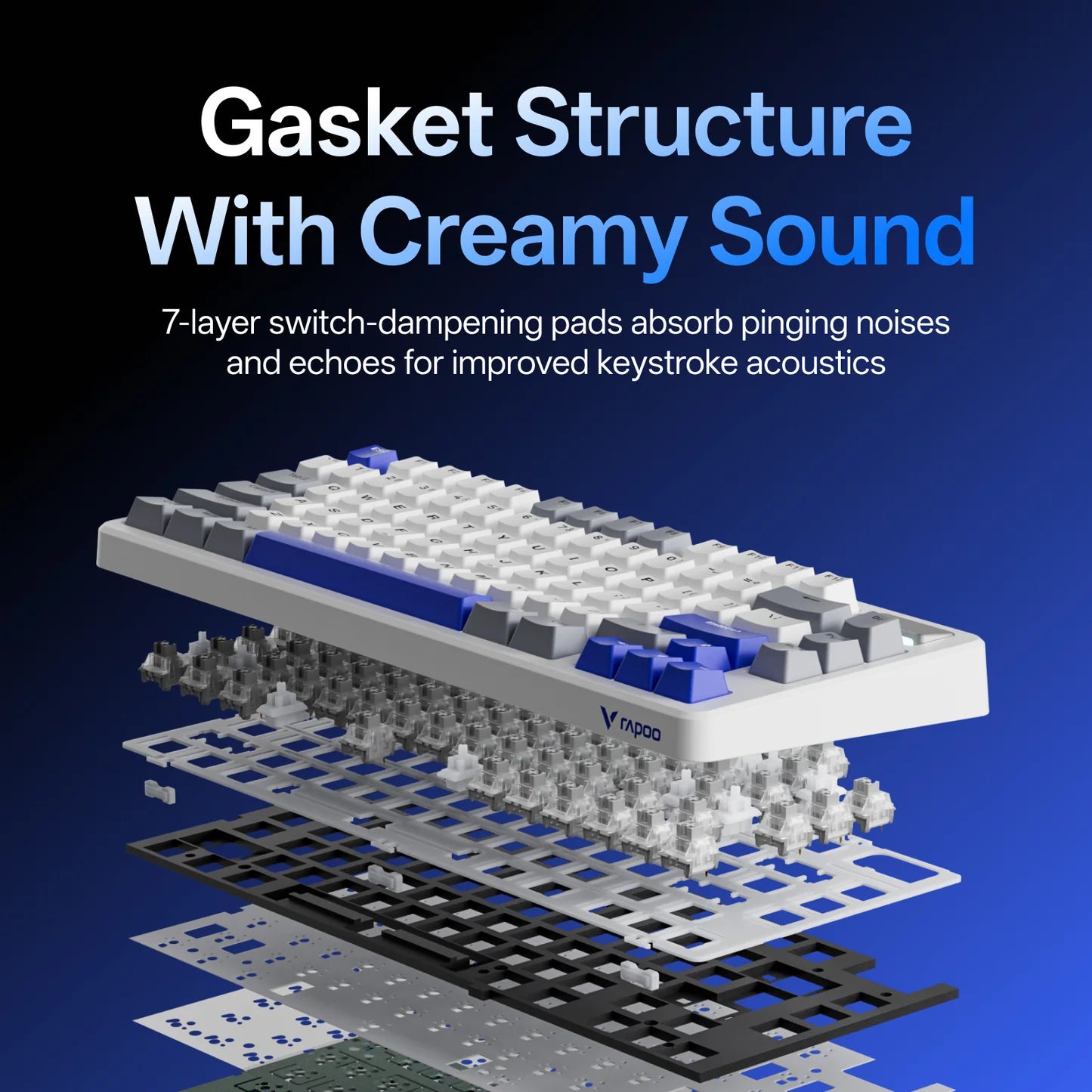 Rapoo V700DIY-75. Wireless mechanical gaming keyboard with tri mode connection, hot swappable speed silver switches, 16.8M per key RGB, full NKRO and gasket mounted creamy typing feel.
