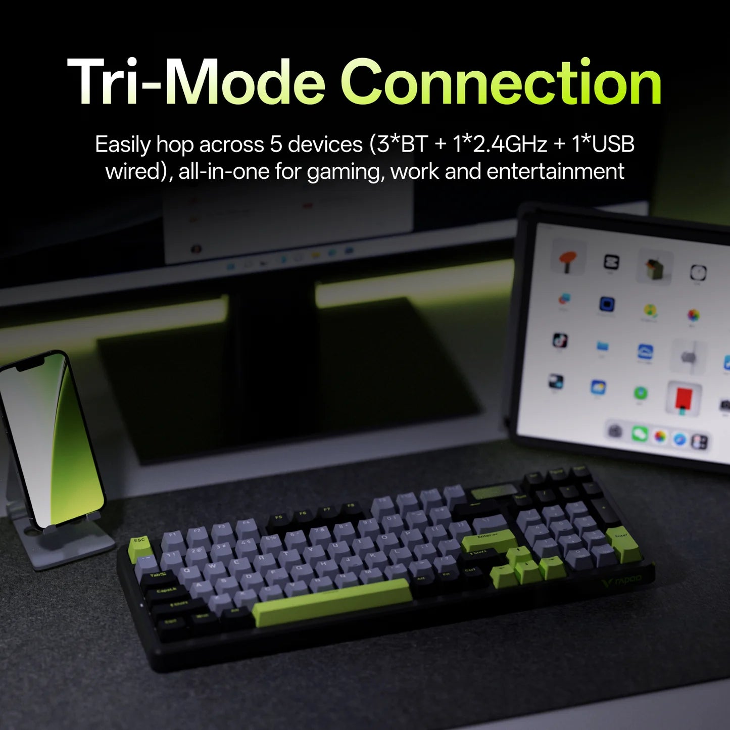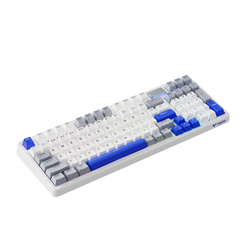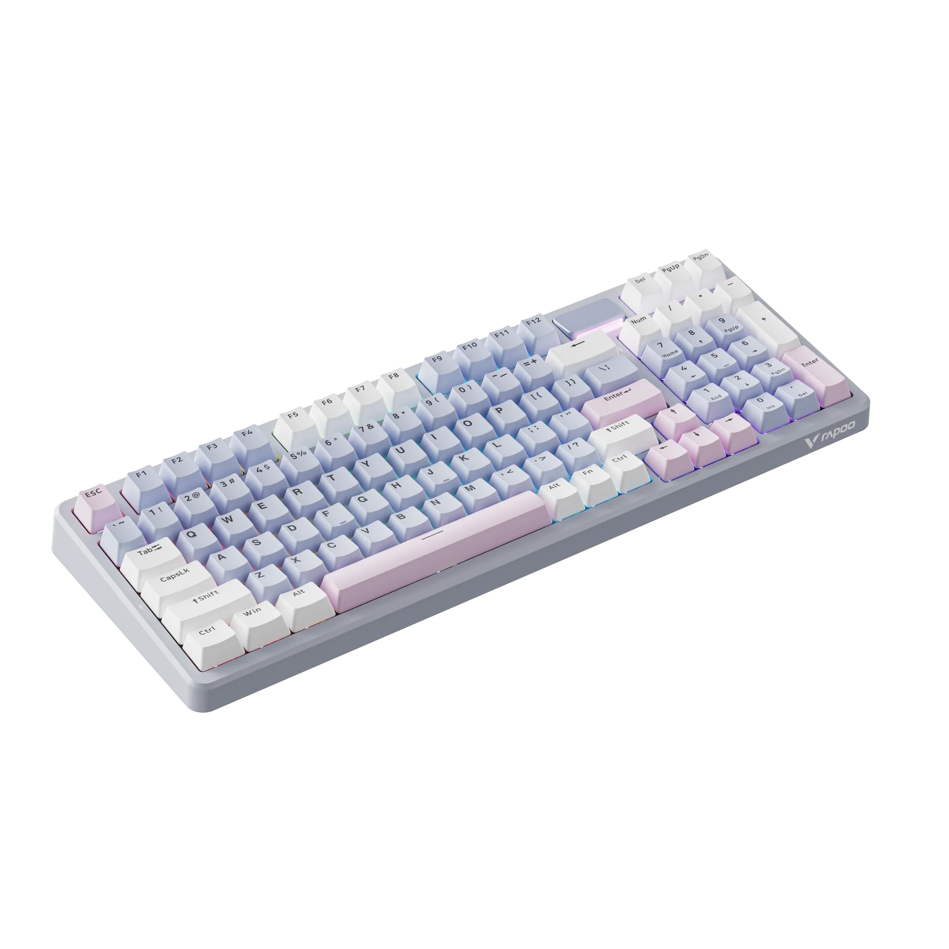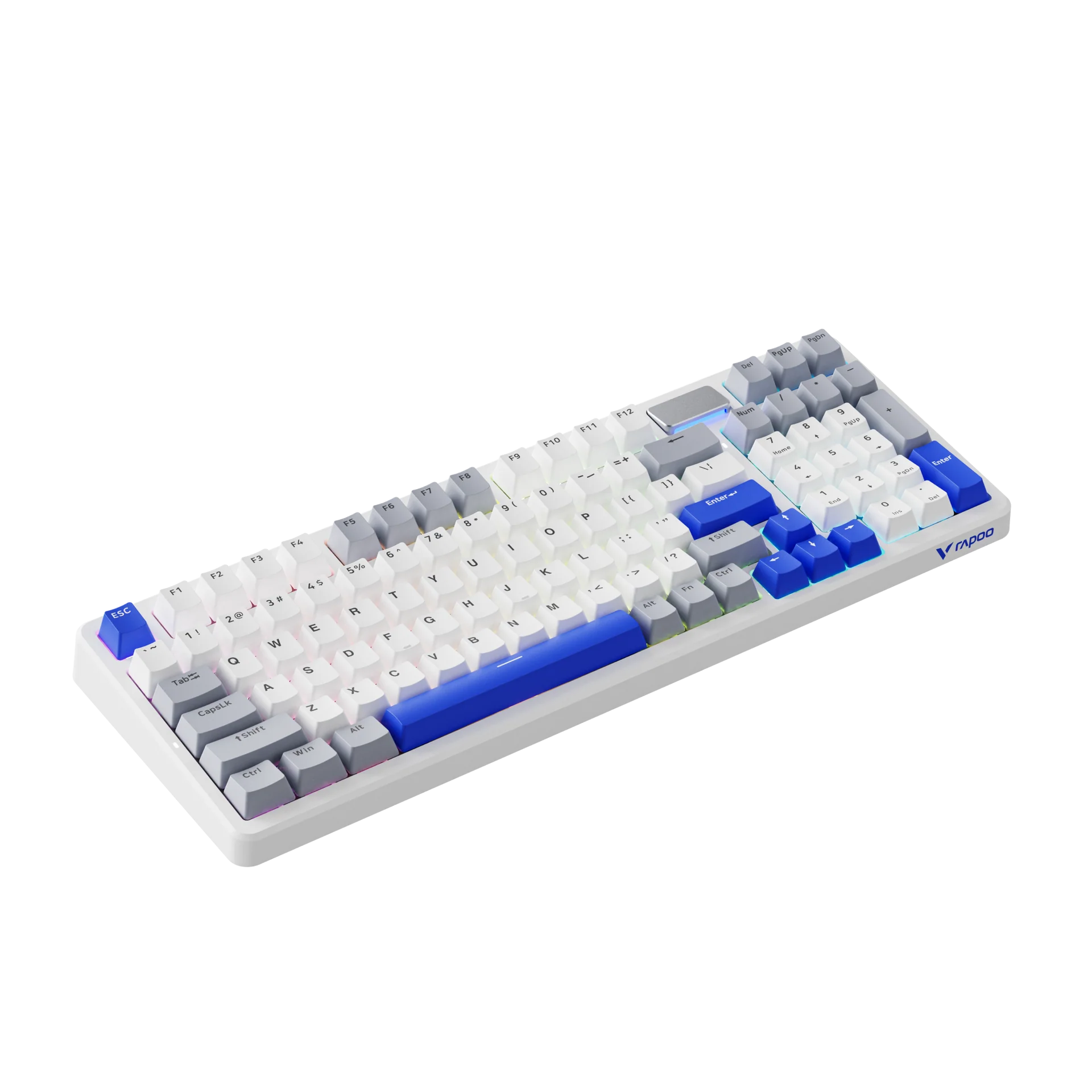 Rapoo V700DIY-98. Wireless mechanical gaming keyboard with tri mode connection, hot swappable speed silver switches, 16.8M per key RGB, full NKRO and gasket mounted creamy typing feel.