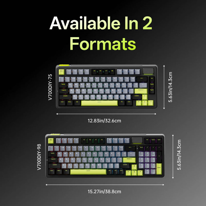 Per key 16.8M RGB lighting is fully customisable, and the gasket mounted design ensures smooth, dampened keystrokes with a premium sound. Full N key rollover eliminates ghosting, while doubleshot PBT keycaps guarantee long lasting durability. FN media hotkeys add convenience for playback, volume and lighting control. With its 98 percent compact layout, the V700DIY-98 offers both power and practicality.